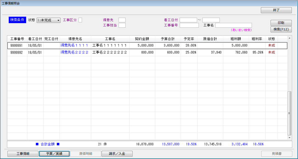 プロジェクトの内容・進捗状況・原価を、帳票や画面照会によってタイムリーに把握できます。